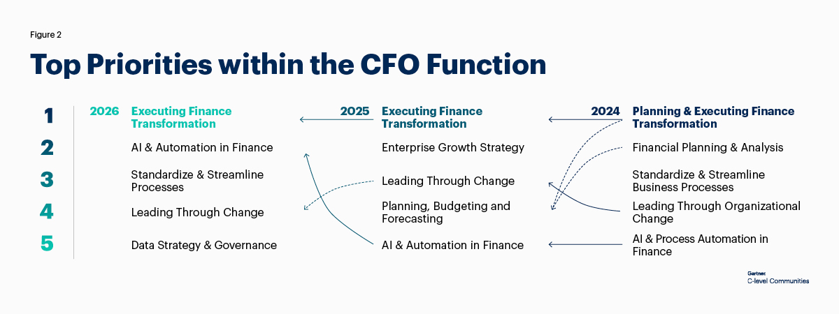 For 2026, CFOs’ enterprise-wide priorities have shifted. Increasing operational efficiencies and productivity has overtaken driving growth as the top enterprise focus, with driving growth now in a close second place. Optimizing costs remains the third-highest priority.