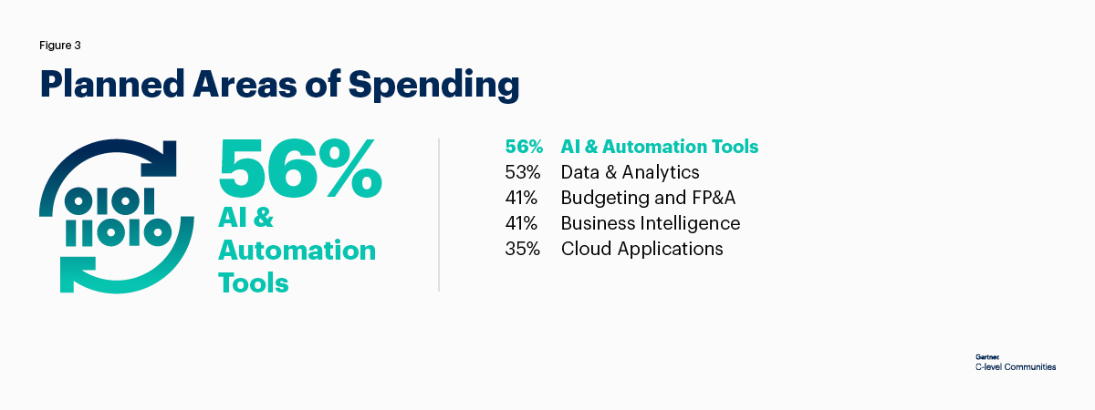 CFOs’ planned areas of investment remain largely consistent with last year’s trends. More than half (56%) intend to invest in AI and automation tools, while 53% are prioritizing spending on data and analytics – both closely aligned with their top strategic priorities. Additionally, 41% of CFOs plan to allocate resources to both budgeting and FP&A, as well as business intelligence.
